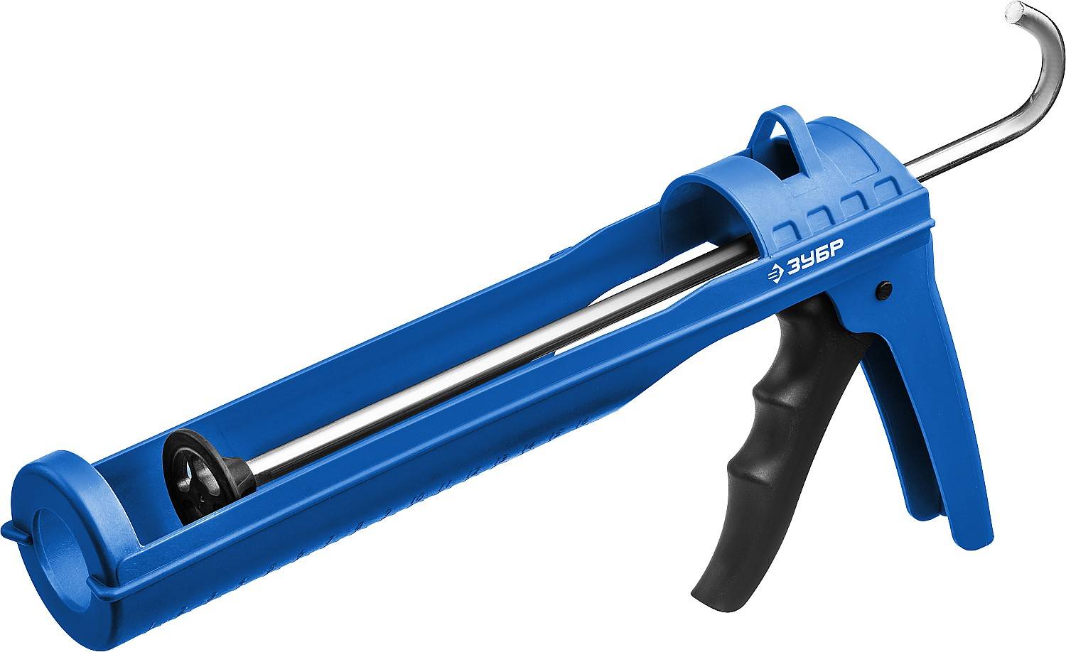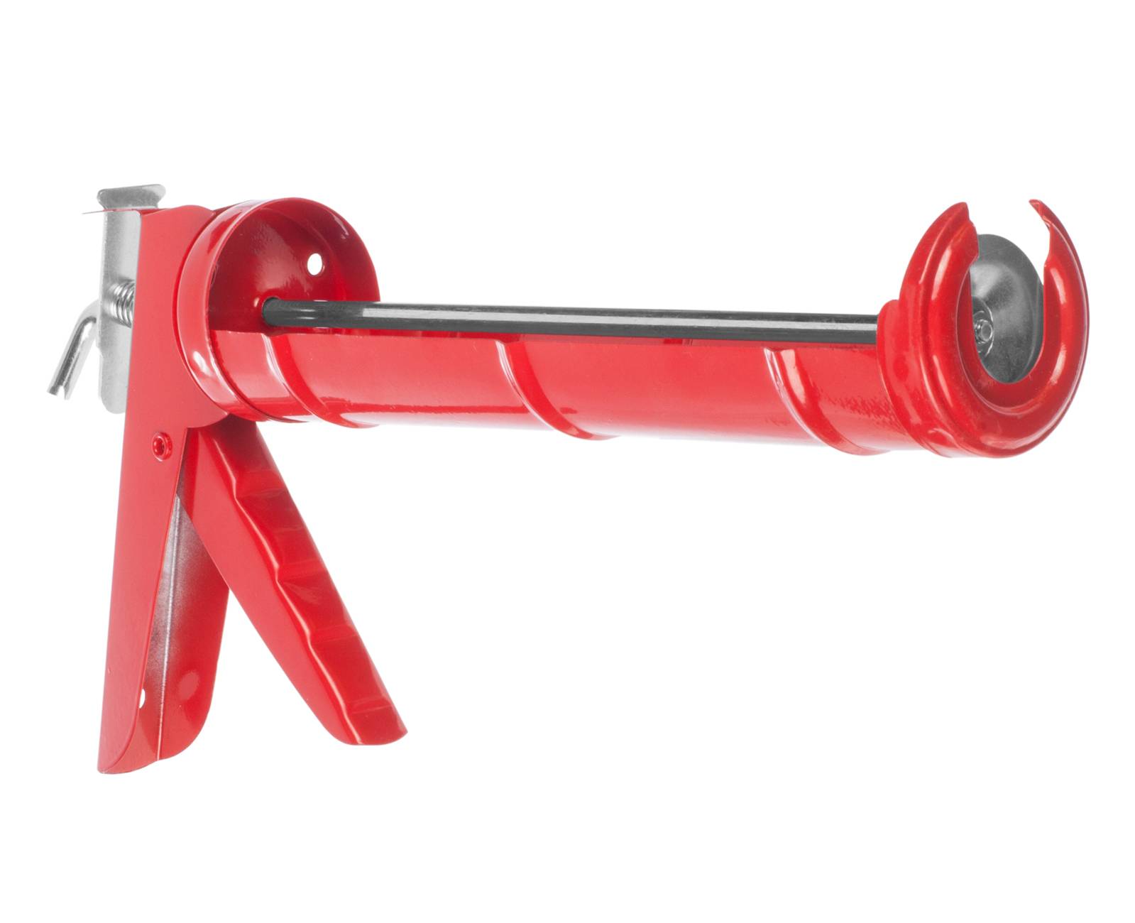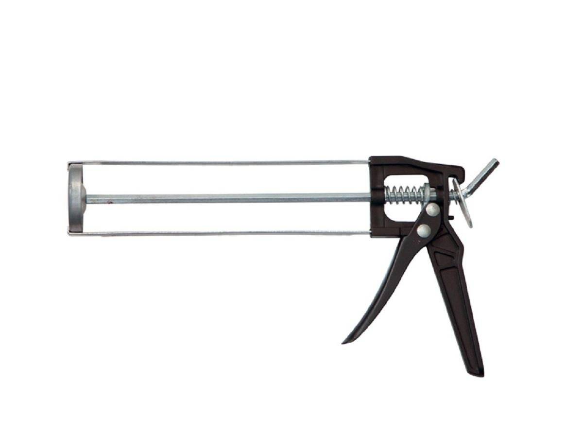 Данная модель пистолета имеет полуоткрытый металлический корпус и гладкий шток. Пластмассовая рукоятка размещена по центру, тем самым снижая нагрузку на руку. Чтобы приступить к работе, нужно отрезать наконечник картриджа, вставить емкость под углом 45 градусов в специальный отсек. Давление поршня выдавливает определенное количество материала. Он отлично подходит для мелких строительных работ. Пистолет имеет простую конструкцию, с которой справятся даже новички.