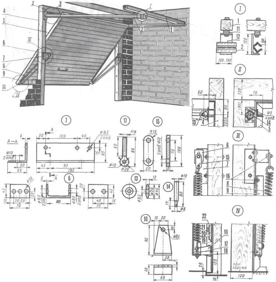 После установки поворотного механизма и предварительного закрепления рычага фиксируется компенсационная пружина с помощью кронштейнов, выполненных из швеллеров. Затем створка поднимается вертикально и своими роликами вводится в профиль рельсов на потолке гаража.
