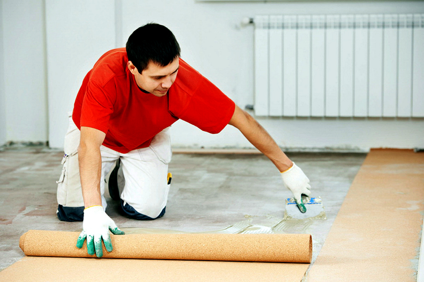 Когда укладка пробковой подложки под линолеум закончена, можно приступать к настилу финишного покрытия.