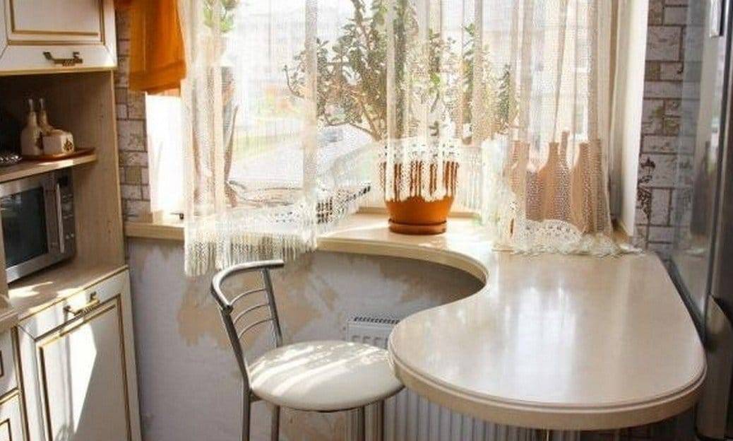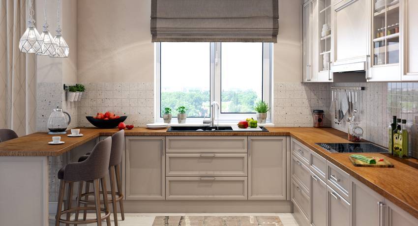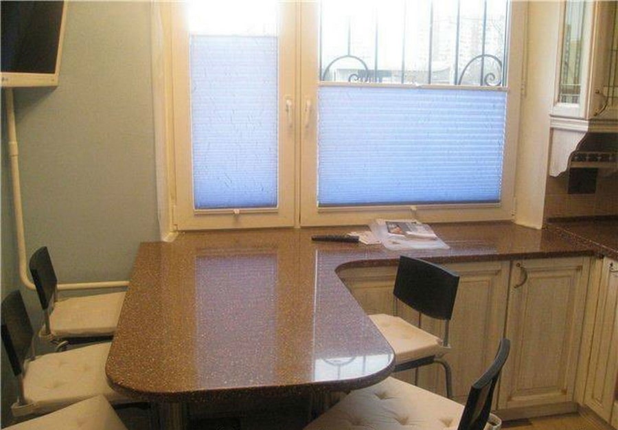 П-образные – площади стандартного подоконника может быть недостаточно, чтобы разместить семью из 3-4 человек. Если планировка позволяет, можно продолжить столешницу барной стойкой или полноценным столом.