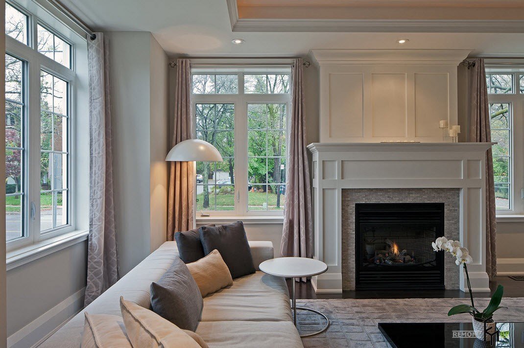 Примеры оформления камина под окном
