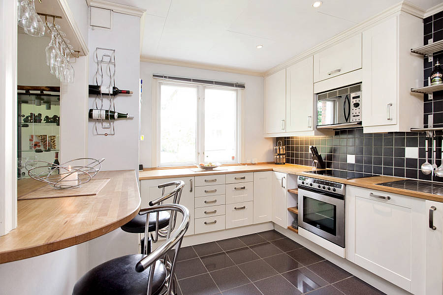 Раскладные – часть столешницы может складываться на подоконник или опускаться вниз, чтобы не мешать передвижению на кухне, а при необходимости – превращаться в полноценный обеденный стол, за которым смогут свободно расположиться несколько человек.