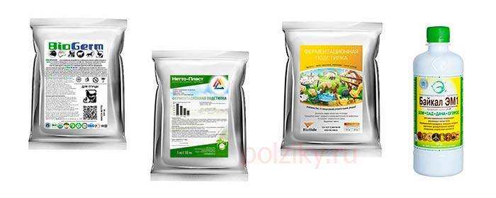 Существует огромное количество биопрепаратов для приготовления бактериальной подстилки в птичнике (БиоГерм, Нетто-Пласт, Био-Сайд, Байкал ЭМ1).