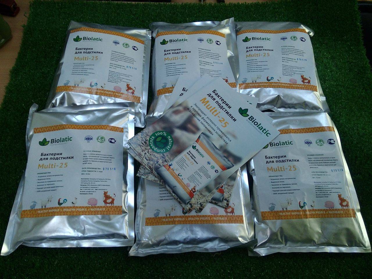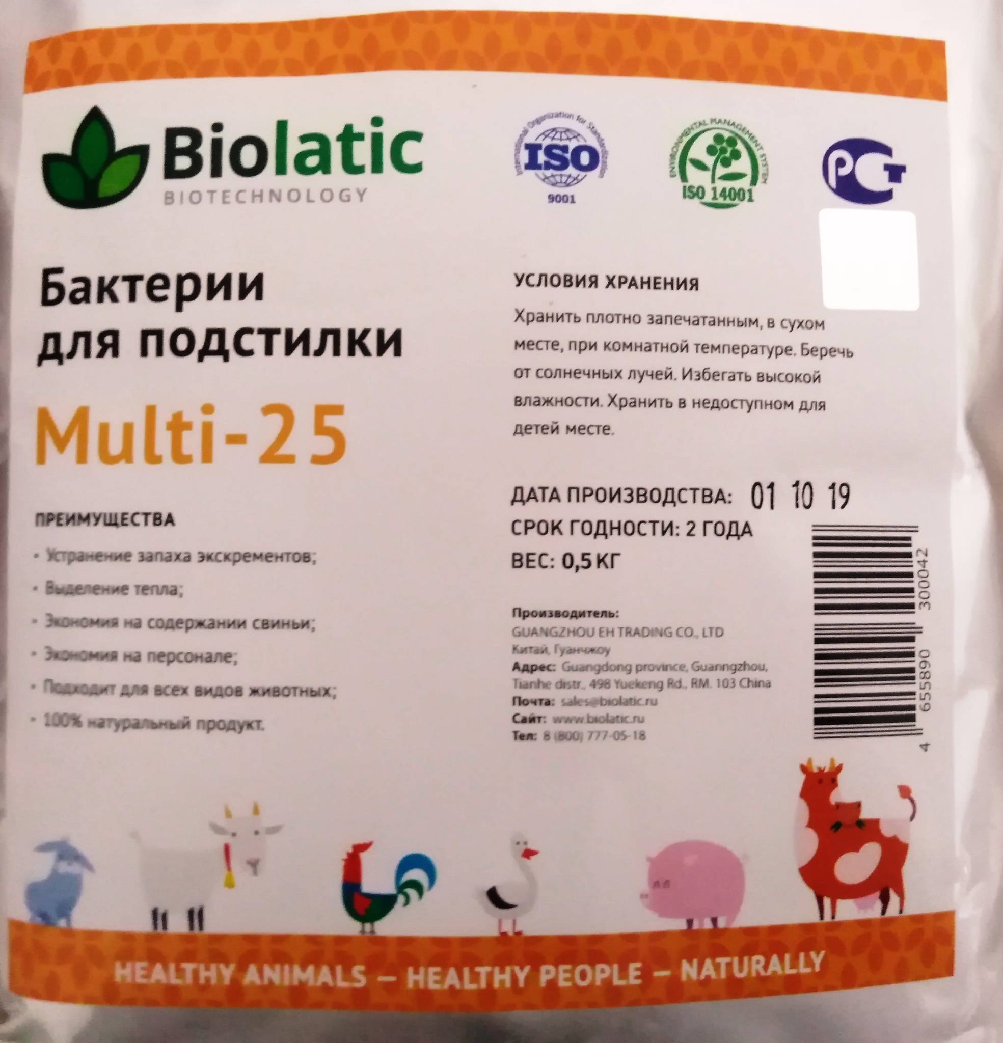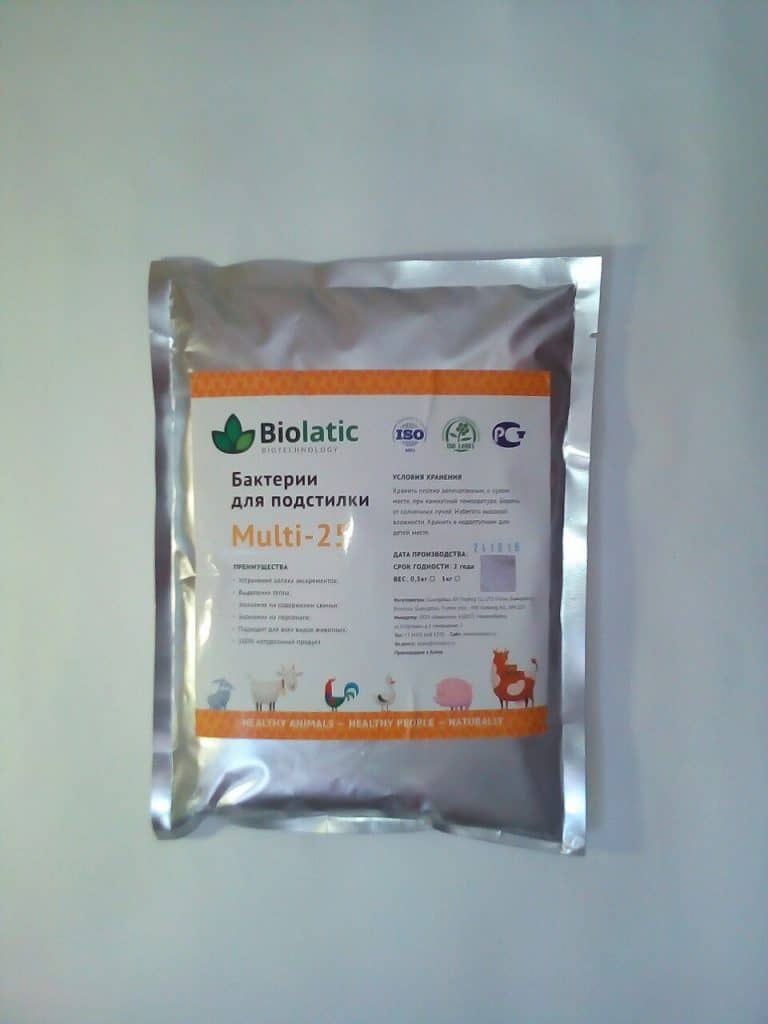 - Biolatic Multi-25. Бактерии международного бренда (Гонконг). Прослужить такая подстилка может до 2-3 лет. Расход составляет 0,5 кг бактерий на 10 кв. м. Использовать можно и с водой, и без нее.
