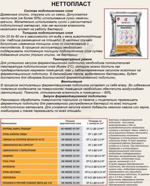 - Нетто-пласт. В основе ферментационной подстилки – безопасные фотосинтетические и кисломолочные бактерии. В процессе их деятельности отходы разлагаются на простые компоненты, при этом выделяется тепло и нейтрализуется неприятный запах. Необходимая толщина слоя – 20 см. Одна пачка бактерий массой 0,5 кг рассчитана на 10 м2. Цена – 2500 руб.