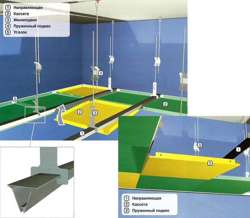 Кассетные конструкции популярны при оформлении потолков с большой площадью: в больницах, торговых центрах, учебных заведениях, в учреждениях.