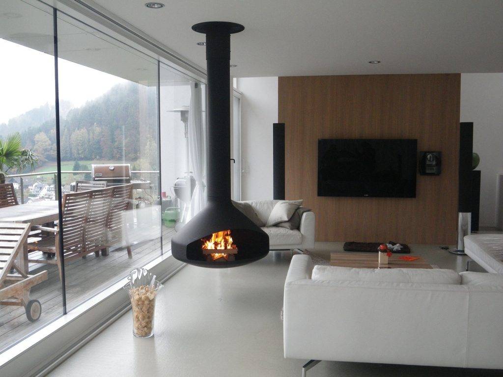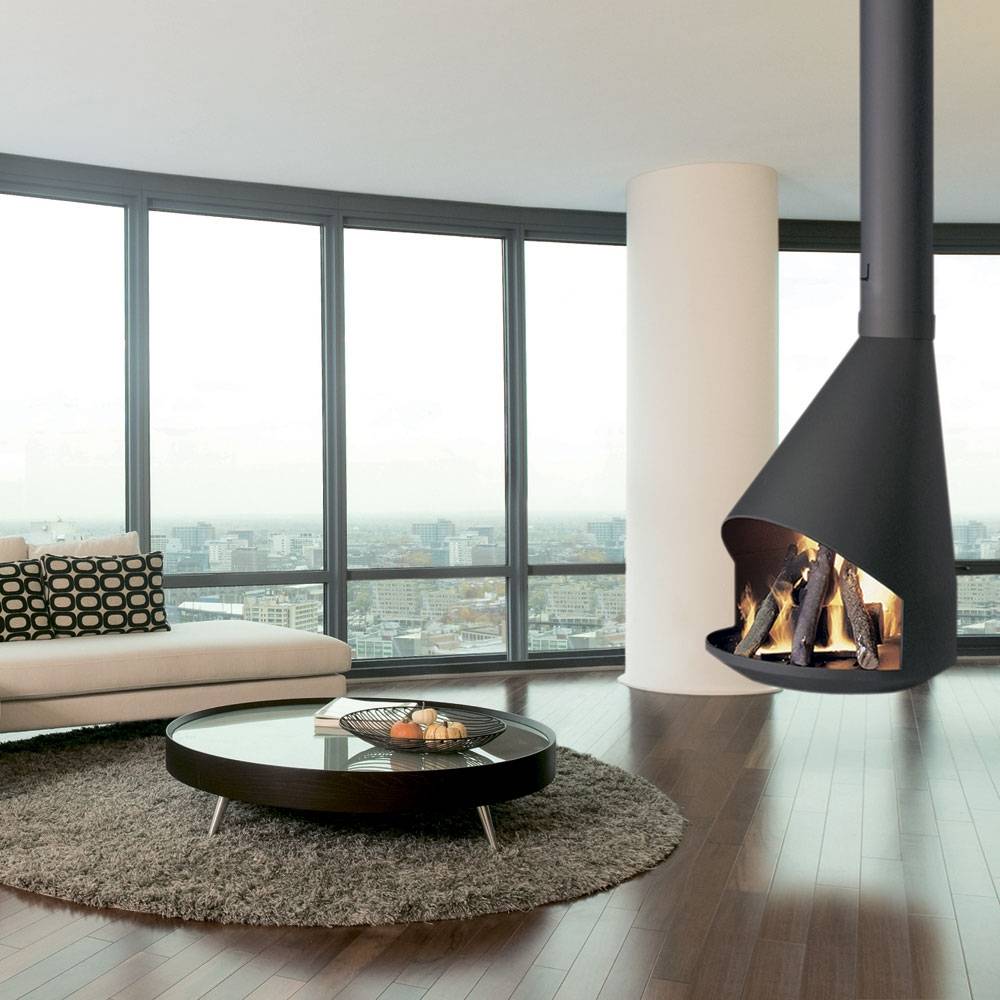 Очень популярен центральный подвесной камин, к которому можно подойти с любой стороны и соответственно – расставить вокруг него кресла или любую другую мебель. На нескольких фото ниже показаны подвесные камины такого типа.