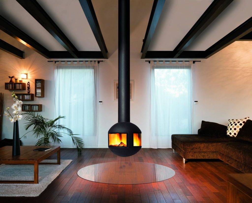 По внешности подвесной камин никак не отнести к классическим вариантам. От прочих разновидностей он отличается тем, что не имеет основы, установленной на полу, и не соприкасается со стенами. Эта разновидность подвешивается на дымоходе, что в качестве камина в интерьере выглядит необычно и весьма интересно.