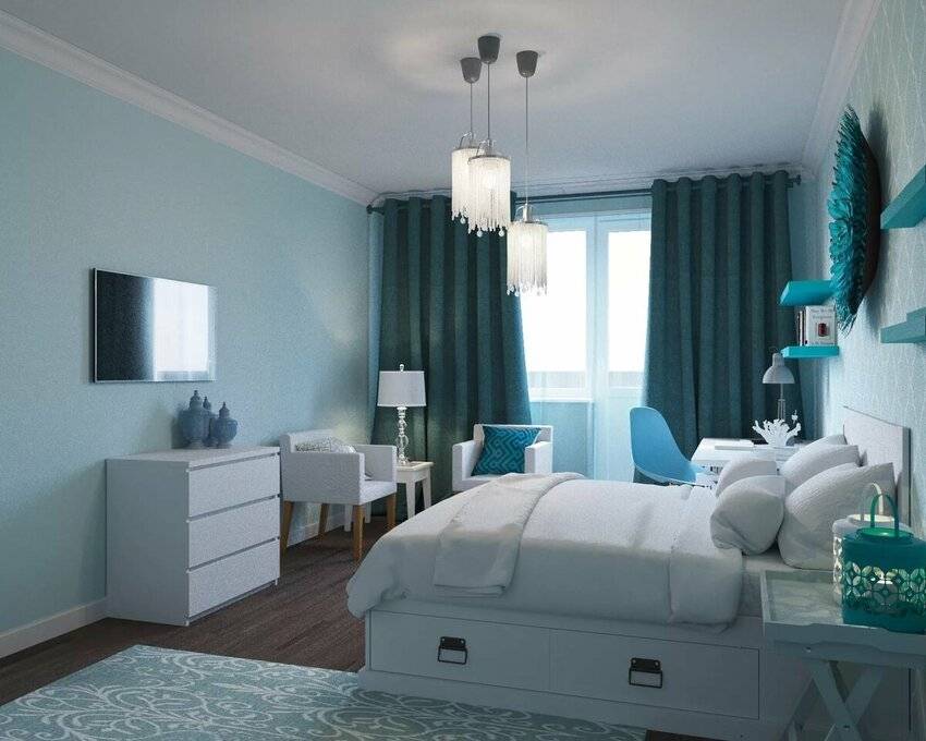 Не менее популярным при отделке спальни становится бирюзовый, добавляющий энергичности и легкости.