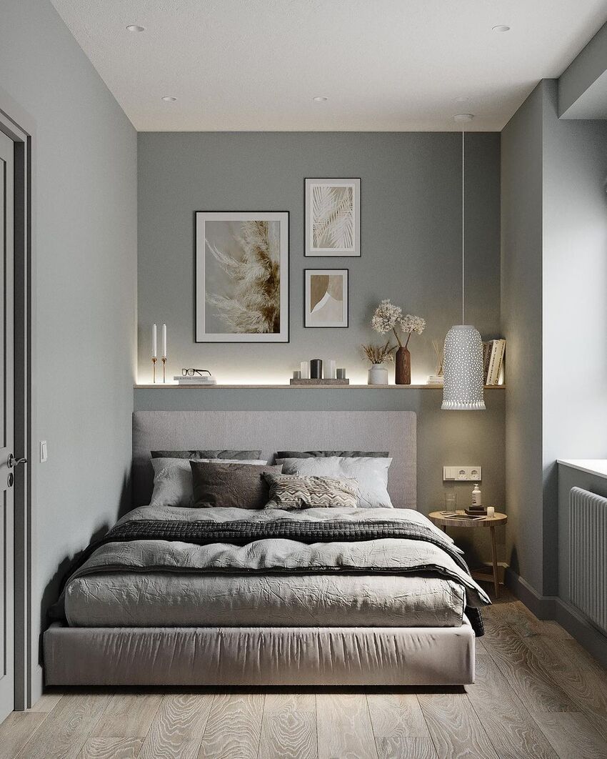 Серые стены в спальне можно сочетать с серыми узорами на ковре, белой мебелью, перегружать спальню такого цвета не нужно.