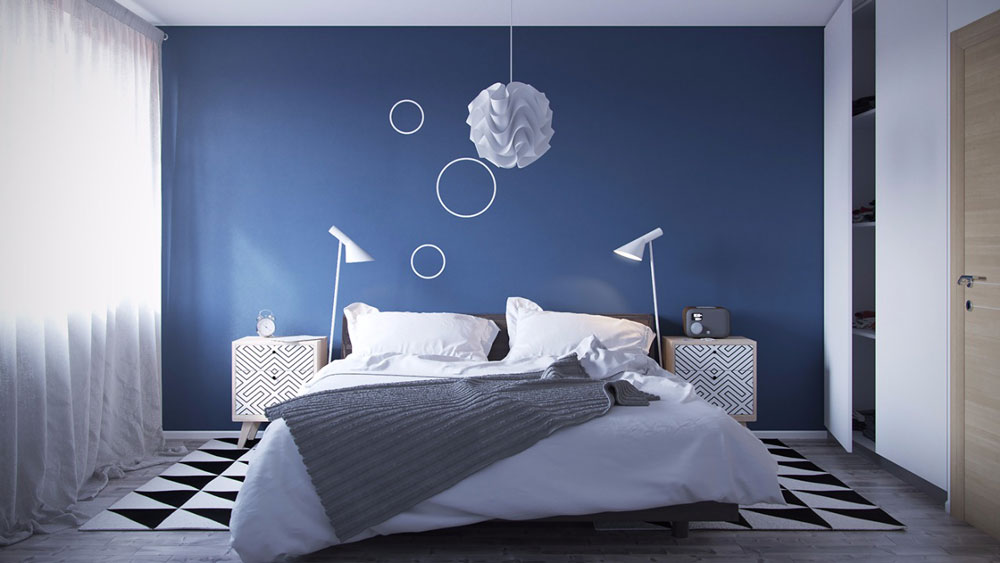 Голубые стены в спальне подходят к темной и светлой мебели, вызывает положительные эмоции, расслабляет и успокаивает. Подходит для солнечных комнат, так как при недостаточном освещении вызывает усталость и слабость.