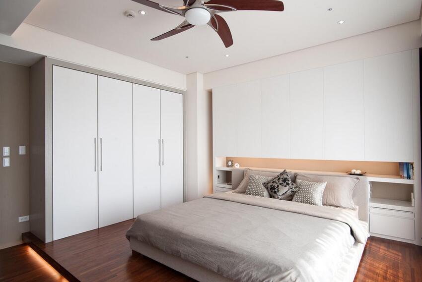 Белые стены в спальне подходят как к светлой, так и темной мебели. Требует акцента на детали контрастного цвета, сочетается с любым стилем, расширяет спальню.