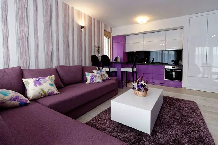Место, в котором проводят время в кругу друзей или наслаждаются одиночеством, должно быть предельно комфортно. Чистый лавандовый фон будет слишком ярким, поэтому лучше брать сочетание оттенков с припыленностью. Хорошо подойдут белые или благородные серебристые цвета.