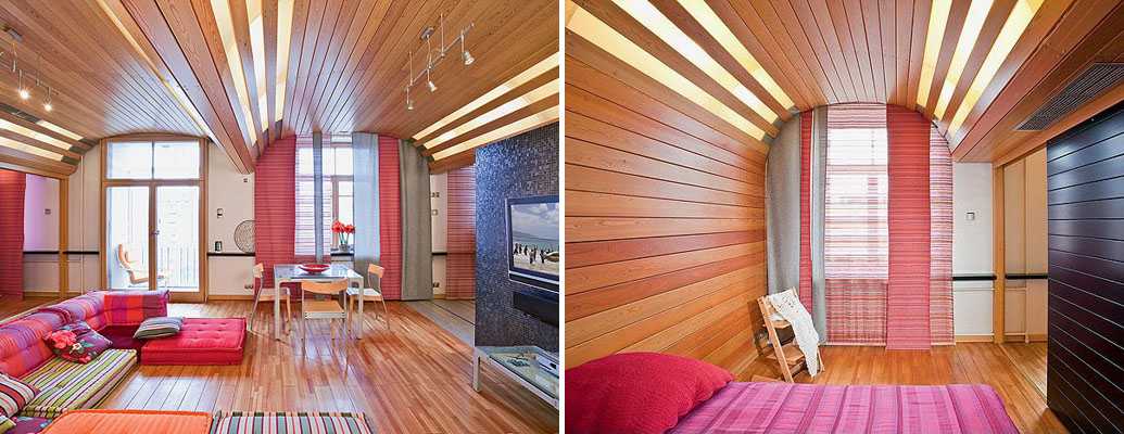 Стиль «эклектика» требует отделки одной или двух стен полностью вагонкой, расположив ее горизонтально.
