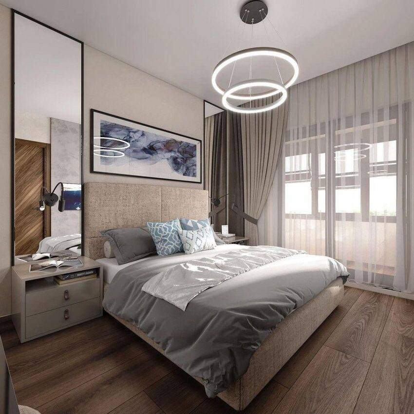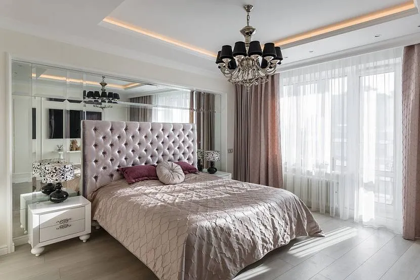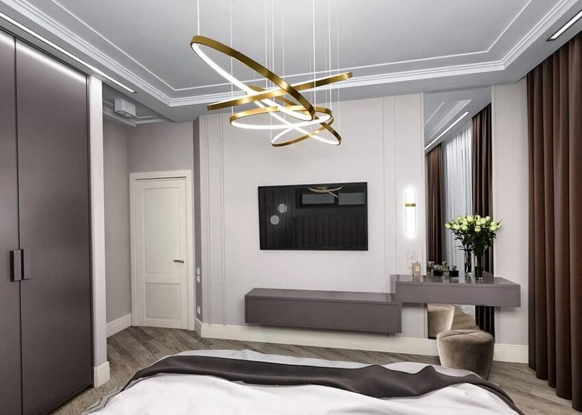 Например, установка центральной люстры, которая украшает интерьер, великолепно сочетается со скрытой светодиодной лентой, придающей спальне загадочность и романтичность.