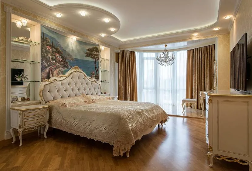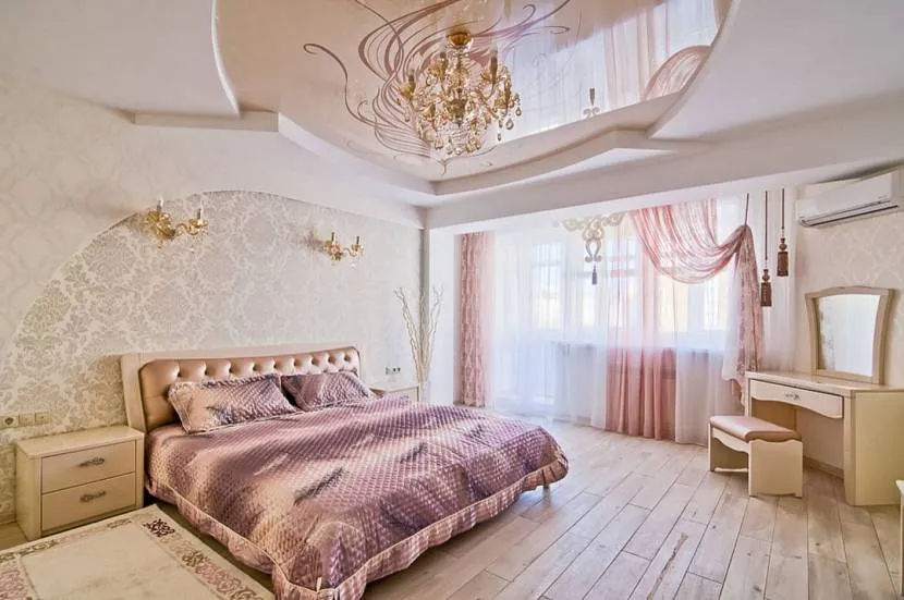- двухуровневые — способны подарить пространству визуальный простор, изменив до неузнаваемости все пространство. Если вы хотите придать спальне изысканность, нарядность, торжественность, то дизайн этого подвида потолочных конструкций нужно подойти грамотно. Тогда двухуровневые потолки будут настоящим украшением для вашей спальни;