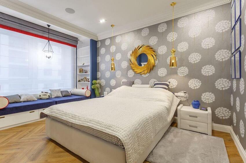 - Более просторные комнаты с низкими потолками дают больше возможностей. Для такой спальни рекомендуются несложные узоры, занимающие не более половины поверхности. Также по центру и в одном или двух противоположных углах могут создаваться овалы. Чтобы нивелировать ощущение тяжести, в нишах размещаются светильники.