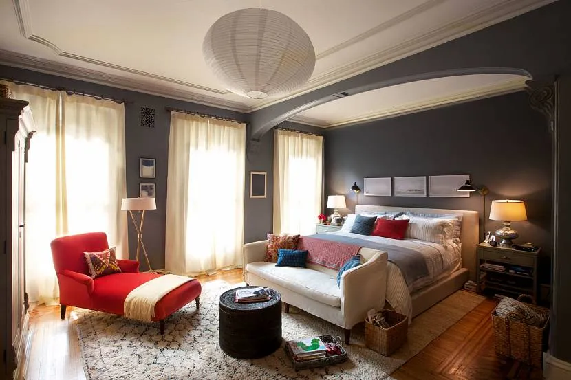 Узкие длинные комнаты хочется поделить поперечной полосой на более равновесные зоны. Это можно сделать при помощи акцентной полосы, которая начинается у изголовья кровати и плавно перетекает на потолок. Она может проходить через все перекрытие или же покрывать его часть.