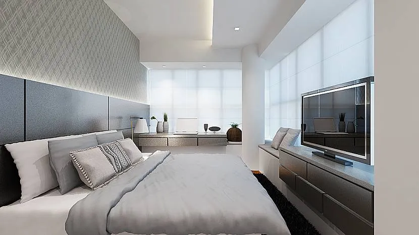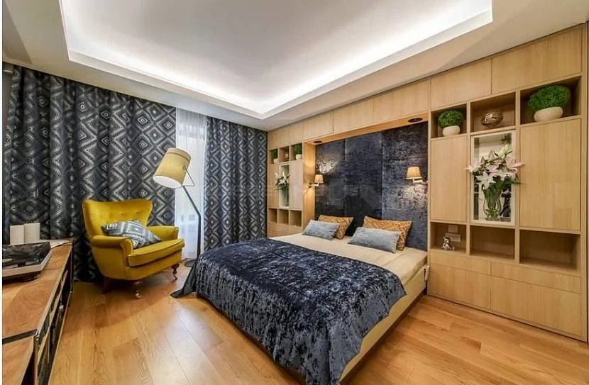 С точки зрения автора, оптимальная конструкция такого потолка — имеющий максимальную высоту потолок в центре комнаты, и потолочный короб со встроенными светильниками по периметру спальни. Короб переходит в нишу со скрытой подсветкой.