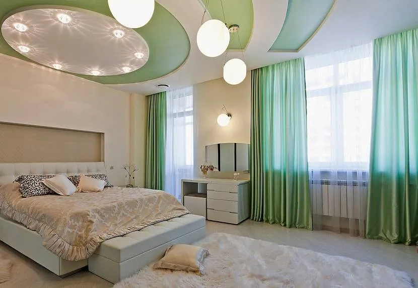 Зеленый считается цветом природы и символизирует жизнь. В дизайне потолка из гипсокартона в спальне применяют только светлые, травяные оттенки. Хорошо смотрится при создании фигурных потолков на растительную тематику.