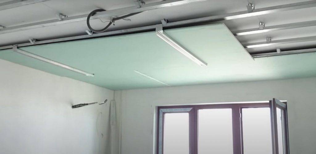 Листы из гипсокартона подшивают к металлическим профилям и на местах будущих светильников прорезают отверстия, для вывода проводов и их размещения.