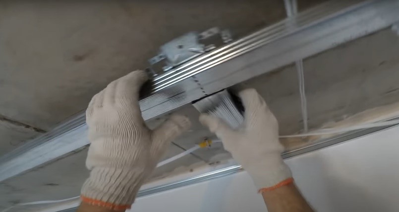 Монтаж потолка из гипсокартона начинают с установки металлических профилей, выравнивая их в один уровень. На этом этапе необходимо продумать размещение всех светильников и сделать к каждому из них проводку.