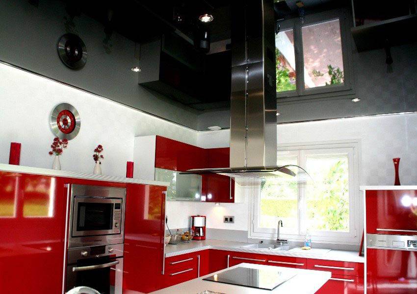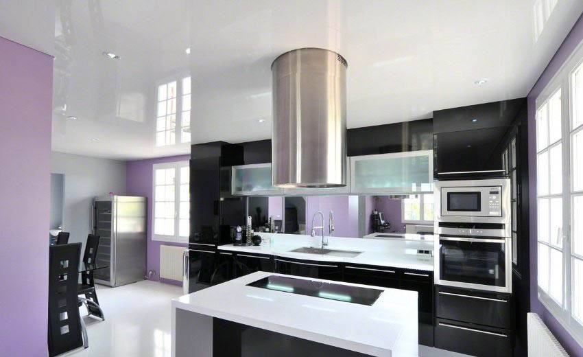 Пожалуй, это наиболее подходящий вариант, поскольку глянцевые поверхности проще всего в уходе, их легко мыть, они не впитывают в себя жир и грязь и не задерживают их на поверхности. Глянец отражает свет, что приближает поверхность такого потолка по свойствам к зеркальной. Он способствует увеличению освещенности, кухня кажется просторнее.