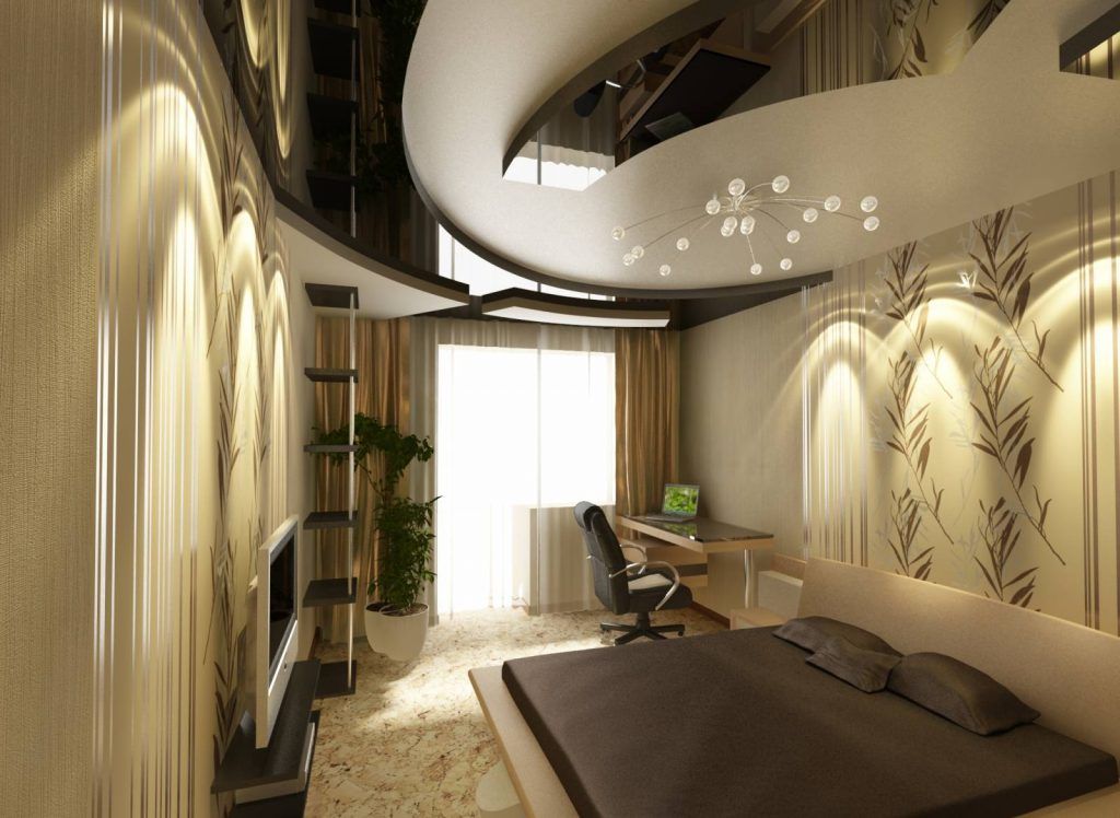 Необходимо необычное освещение в достаточном объеме. Если вещей в комнате немного, можно создать отделку из нескольких уровней или плавающий цветной потолок.