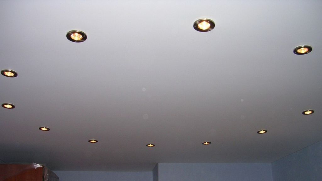 - Чтобы точечное освещение не повлияло на оттенок потолка, следует исключить применение ламп накаливания, заменив их на LED светильники. Для устройства освещения также следует использовать слаботочные приборы с установкой понижающих трансформаторов.