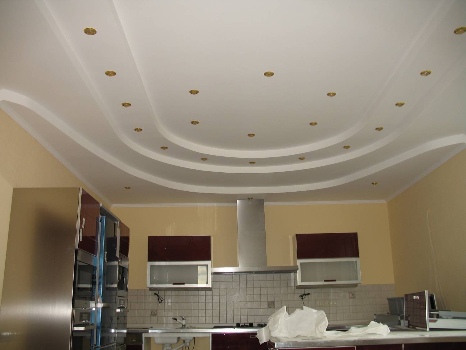 Многоярусные системы (более двух уровней), в маленьких кухнях, менее 10 кв. м, надо исключить поскольку каркас уменьшит и без того низкую комнату. Чтобы поверхность приняла идеально ровные плоскости, необходимо шпаклевать и заделывать швы.