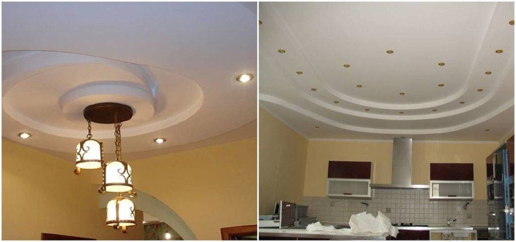Многоярусные системы (более двух уровней), в маленьких кухнях, менее 10 кв. м, надо исключить поскольку каркас уменьшит и без того низкую комнату. Чтобы поверхность приняла идеально ровные плоскости, необходимо шпаклевать и заделывать швы.