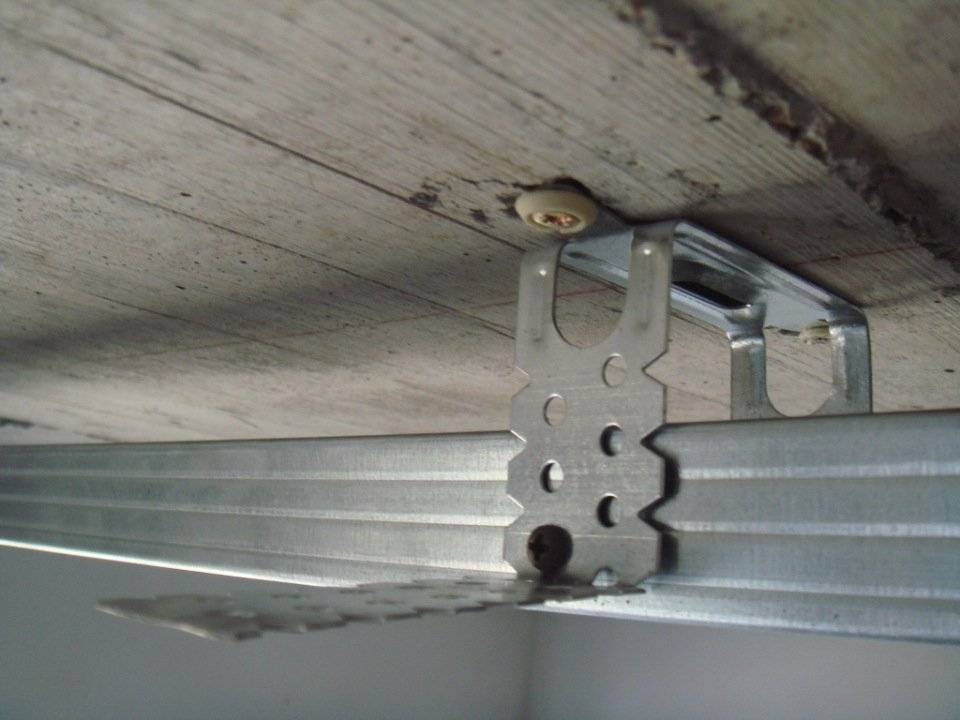- Если каркас монтируется для чернового потолка по балкам из дерева, хватит саморезов. Для бетонного основания придется сверлить дырки под дюбеля.