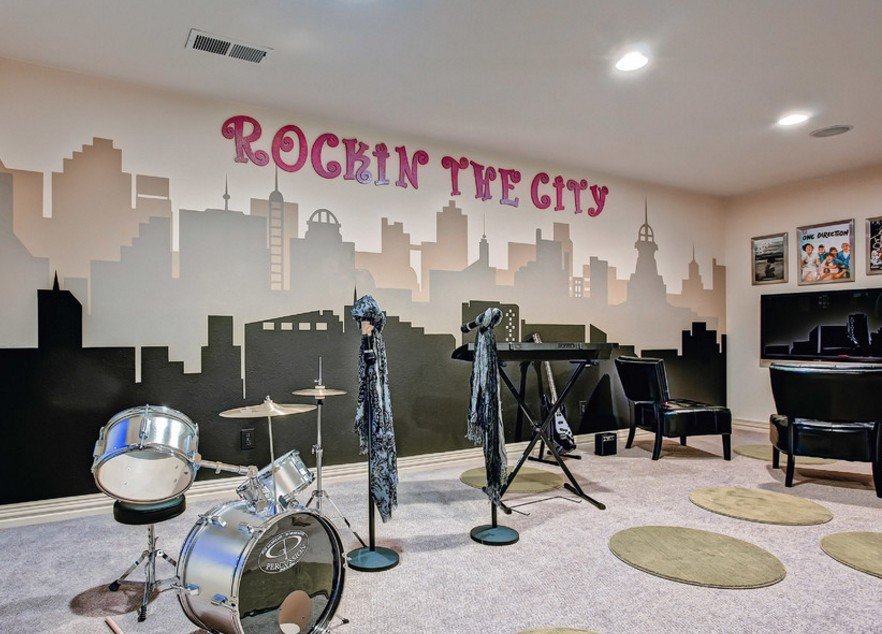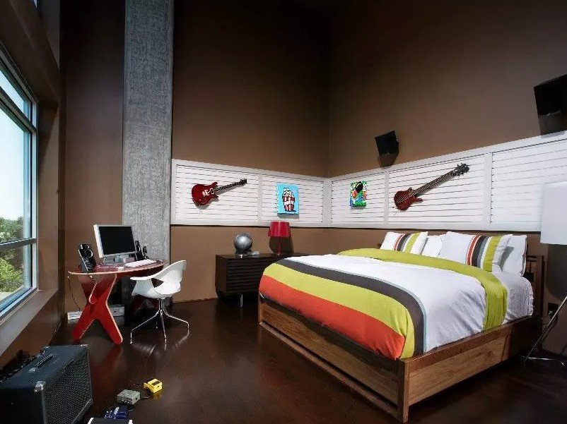 Эту комнату сделали для подростка мальчика. Помимо смелого интерьера здесь сделана хорошая звукоизоляция, что очень полезно если парень любит громко играть на гитаре
