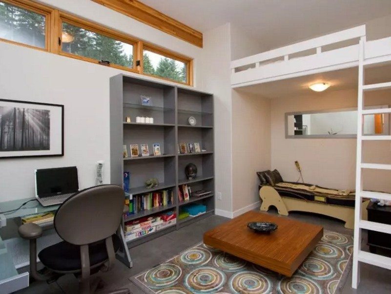 В небольшом пространстве удалось создать рабочую зону, место для отдыха и сна, а также место для хранения вещей.