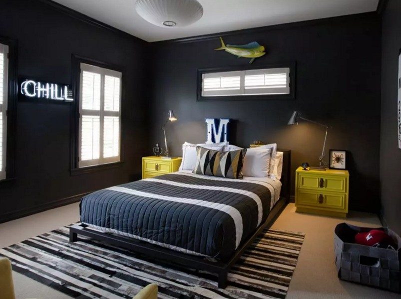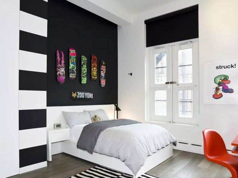 Смело выбирай контрастные сочетания, яркие плакаты, кислотные акценты, неоновые подвески, светильники с эффектом софитов и другие броские решения. Избегай только слишком агрессивных тонов. Все-таки в комнате нужно и работать, и отдыхать.