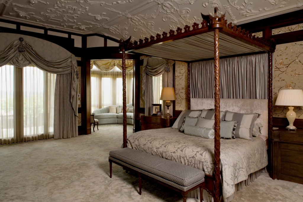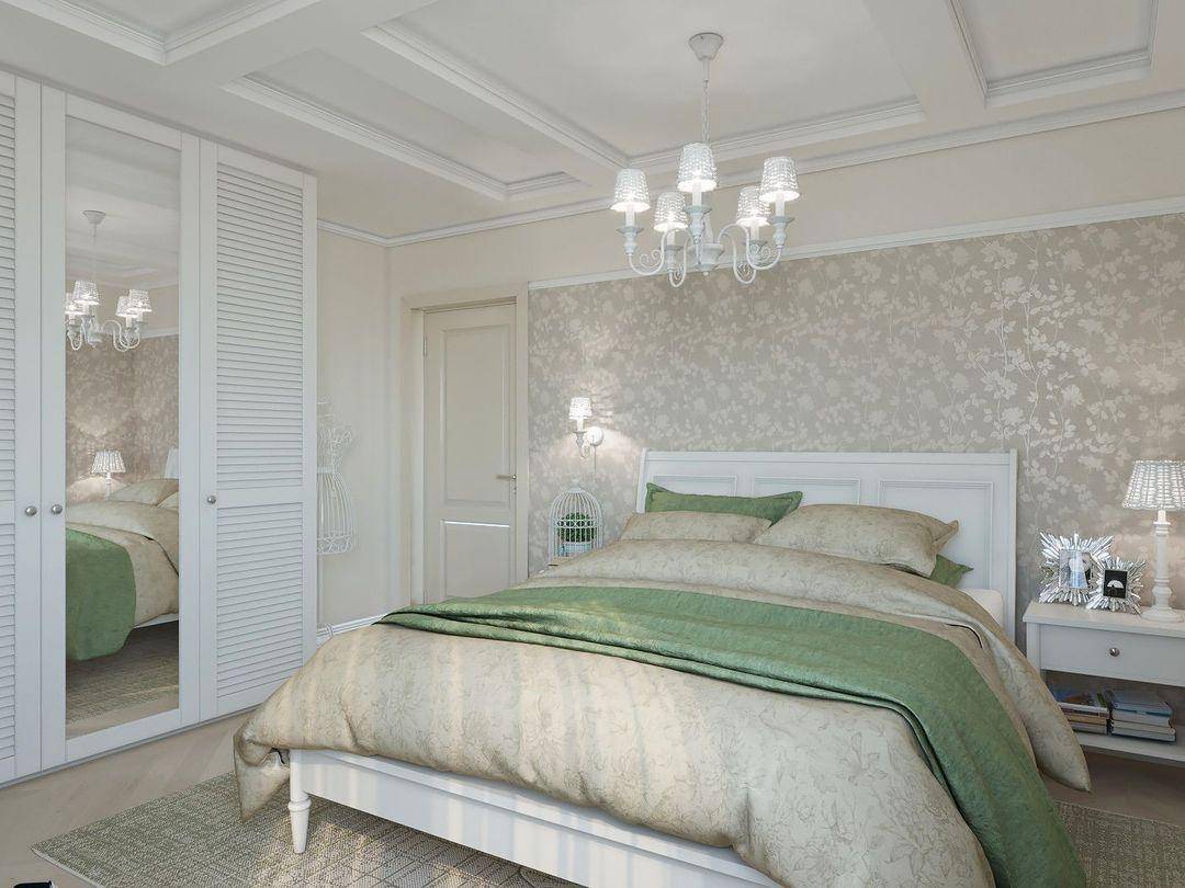 Если ты не представляешь себе спальню без пышного текстиля, люстр и роскошных декораций – рассмотри вариант классического оформления. Цвет отделки лучше выбрать из молочной, оливковой или сиреневой палитры – эти цвета будут отлично сочетаться с лепниной, хрустальными люстрами, золотистыми узорами декора и, конечно, дорогой деревянной мебелью с резными узорами.