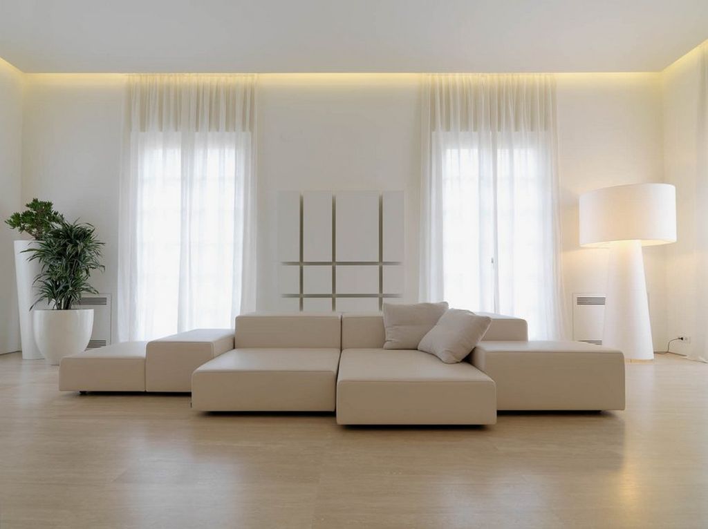 - Диван. Лаконичный, простой и без вычурности. Желательно с глянцевым покрытием. Зачастую его подбирают в тон стен. Светлые спокойные тона приветствуются.