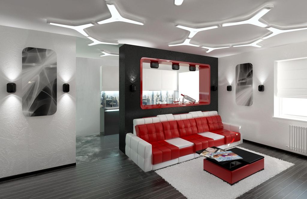 хай-тек предполагает отделку гостиной в виде фигурного натяжного варианта. Можно выгодно использовать современные осветительные приборы. Оригинальная подсветка позволит создать необычный эффект и преобразить гостиную.