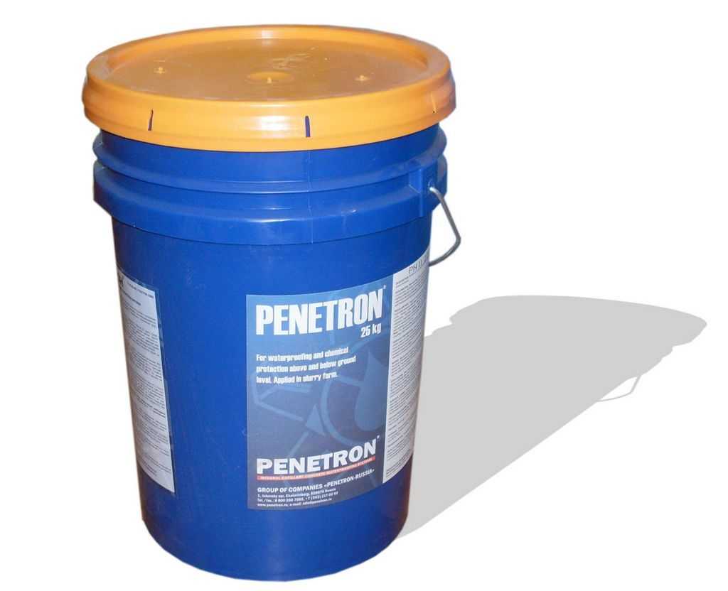 - Пенетрон. Это материал проникающего действия по гидроизоляции железобетонных и бетонных конструкций. Он отлично проникает в структуру бетона, не смотря на его возраст и вид, и тем самым обеспечивает хорошую водонепроницаемость всем конструкциям.