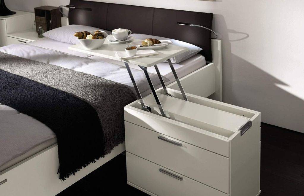 Оригинальной и удобной является конструкция, представляющая собой тумбочку, которая имеет выдвижную столешницу и запросто превращается в столик, за которым можно позавтракать просто в постели.