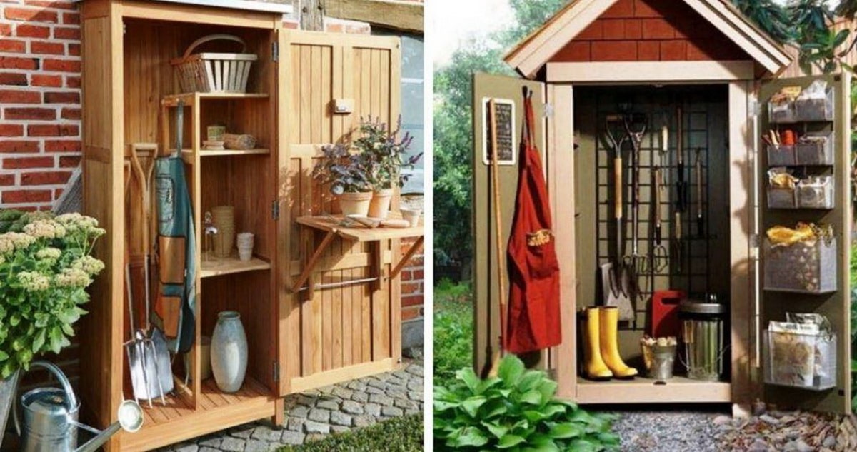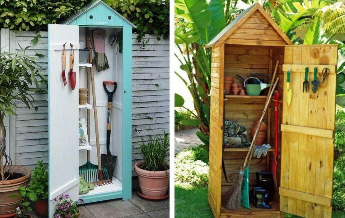 Это хорошая идея, так как не придется каждый раз ходить домой за секатором, а за лопатой в другое место. Устройство шкафа несложное, а сделать такую полезную мебель легко и быстро. Небольшой дачный шкафчик при необходимости можно легко передвинуть в другое место.