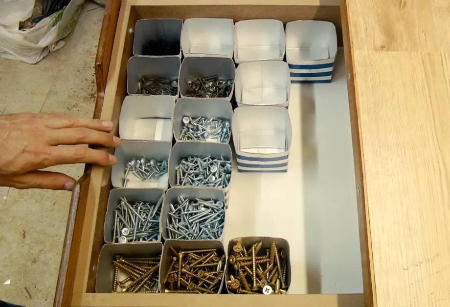 Для хранения мелочёвки по типу гвоздей, шурупов, саморезов, болтов, гаек и так далее, можно использовать небольшие пластиковые контейнеры или использованные коробки из-под молока, которые либо крепятся на доску, что в свою очередь крепится к стене, либо аккуратно сложены в ящик.