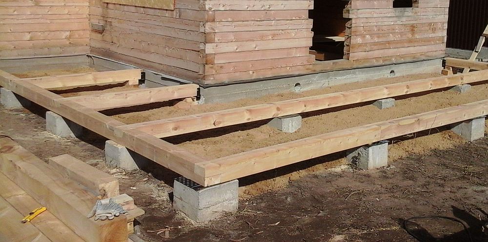 Под половые лаги нужно установить опоры на расстоянии порядка 130-150 см. Лаги лучше всего располагать друг от друга на расстоянии порядка 90 см. Если подобные опоры не были созданы при устройстве основного фундамента, то обязательно их делайте. На такую же глубину во избежание сезонных вертикальных подвижек.