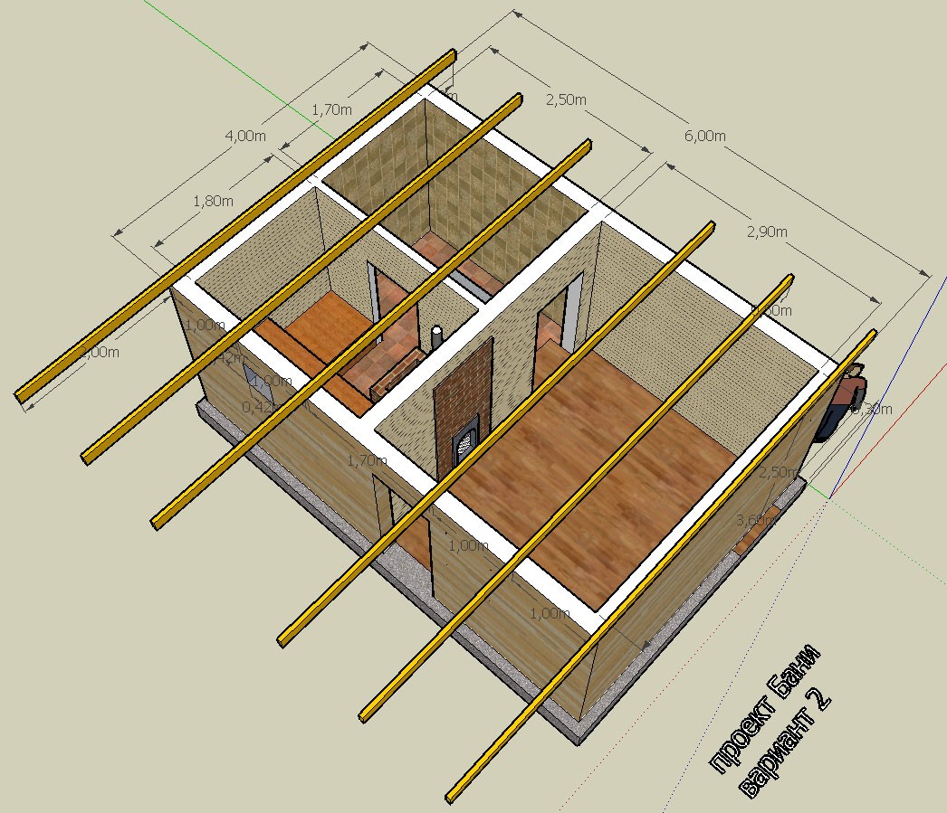 В такой бане, несмотря на маленькие размеры можно уже увлечься планировкой. Если хотите больше свободного места, то расположите моечную в парилке, остальную площадь под комнату отдыха и предбанник. Если хотите с комфортом парится, а потом и с комфортом помыться выделите по 1,5 метра на помещение, можно как в длину, так и в ширину.