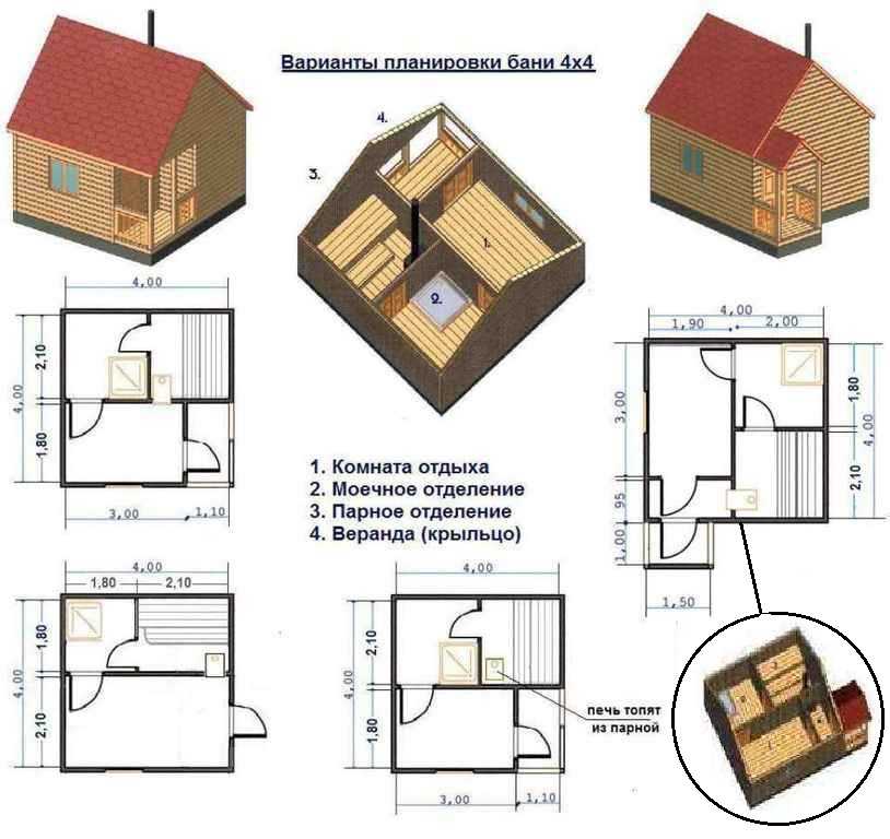 Самая маленькая баня, где очень мало пространства, расположить вы сможете только самое необходимое, всего две комнаты: предбанник и парилка. В данной бане рекомендуется размещать печь так чтобы одной половиной она была в парилке, другой в предбаннике. Мойка в этой бане разместиться в парилке.