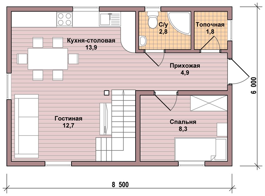 Учитывая приведенные параметры можно оптимально распределить площадь для всех комнат. Месту для отдыха и сна выделить 9 м², расположив его у входа, коридору 4,5 м², топочной – 1,5 м², совмещенному санузлу – 3 м². Зал, расположенный со стороны кухни, займет 18 м², остальные 12 м² остаются на кухонную зону и небольшую кладовку.