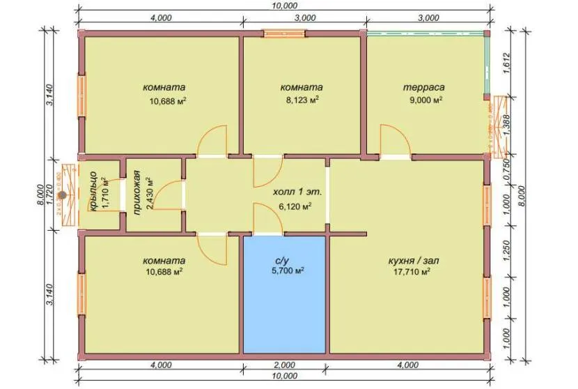 Хороший план дома 8 на 10 м должен быть детализирован до мелочей. Очень важную роль играет продумывание выхода на террасу и ее непосредственного окружения. Конкретные планы строений 8х10 м следует адаптировать к климатическим условиям и параметрам грунта.