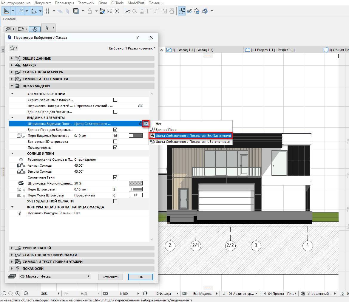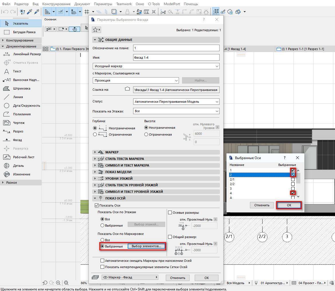 Первое что нужно настроить в параметрах, это отображение осей. На фасадах показываются только крайние оси и оси на перепадах высот.