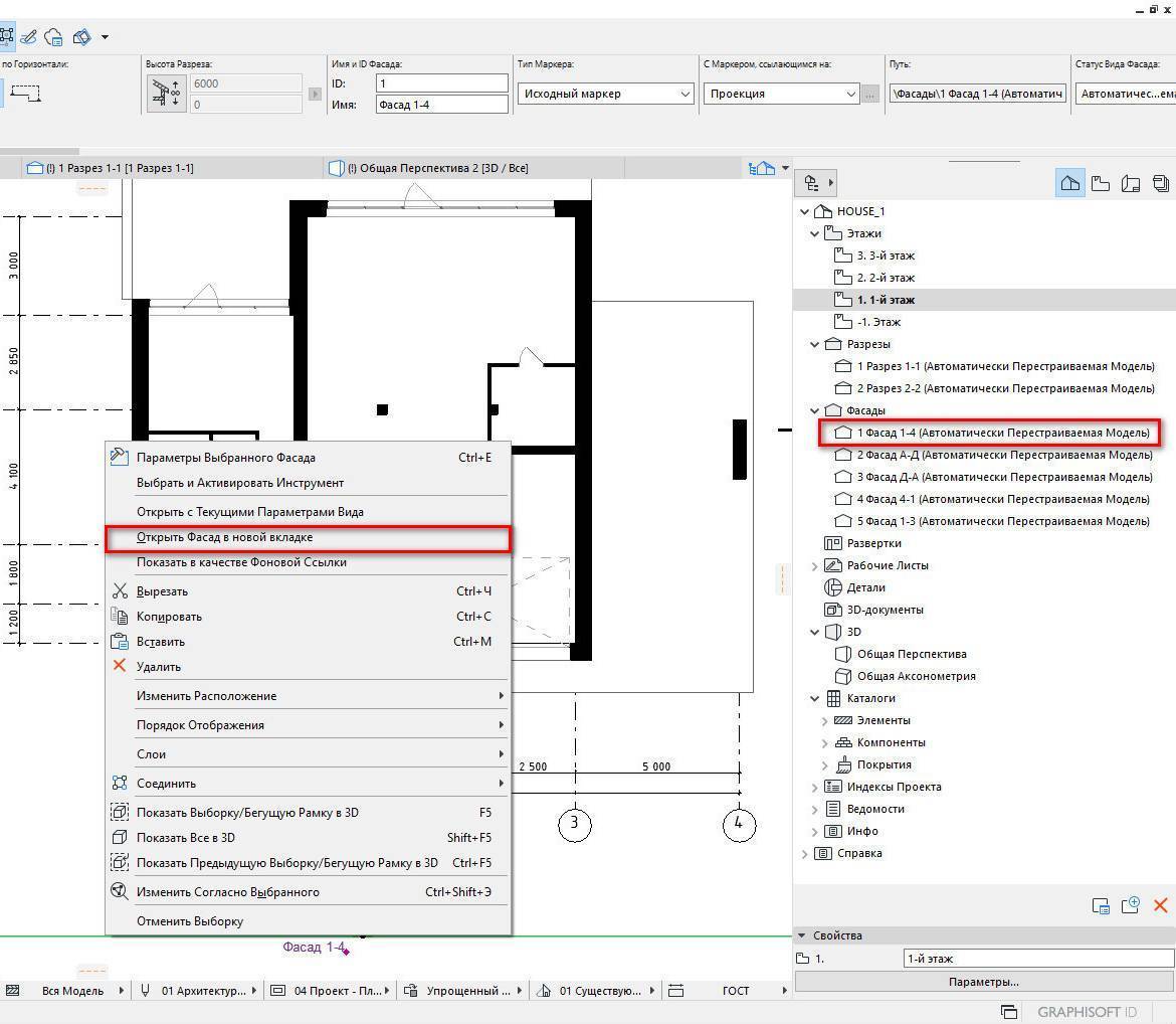 Давайте откроем фасад. Это тоже можно сделать несколькими способами. Из меню, нажав правой кнопкой мыши на фасад, выбрать пункт «Открыть Фасад в новой вкладке». Или через панель навигатора.