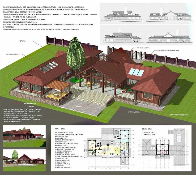 Дополнительно в план могут быть включены кабинеты, библиотека и спортивный зал, бильярдная или боулинг, кинозал. В любом случае пространство зонируется, разделяя личные апартаменты хозяев и общие площади. В качестве стиля в интерьере и экстерьере здания стоит выбирать хай-тек, кантри и его подвиды — прованс, шале, скандинавский.